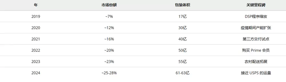 这种市场结构决定了,物流企业需通过与少数大客户签订长期合同获取稳定单量。以亚马逊为例,其市场份额的持续提升并非偶然,而是依靠多年持续投入仓网扩建、农村配送网络以及Prime会员履约体系,逐步建立起客户信任——而这一过程本身就意味着高成本与长周期。