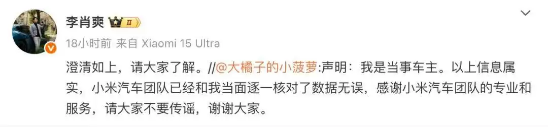 当事人车主也在评论区发布声明,确认小米公司发言人回应的信息属实,小米汽车团队已与其当面逐一核对数据无误,并对小米汽车团队的专业和服务表示感谢,同时呼吁大家不要传谣。