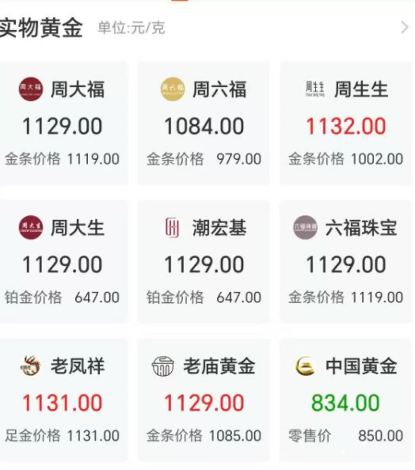 国内每克黄金的零售价也是一天一个价,从898元一路飙到1134元,周大福(01929.HK)、周大生(002867.SZ)、老凤祥(600612.SH)这些金店牌子已经全线突破1100元。