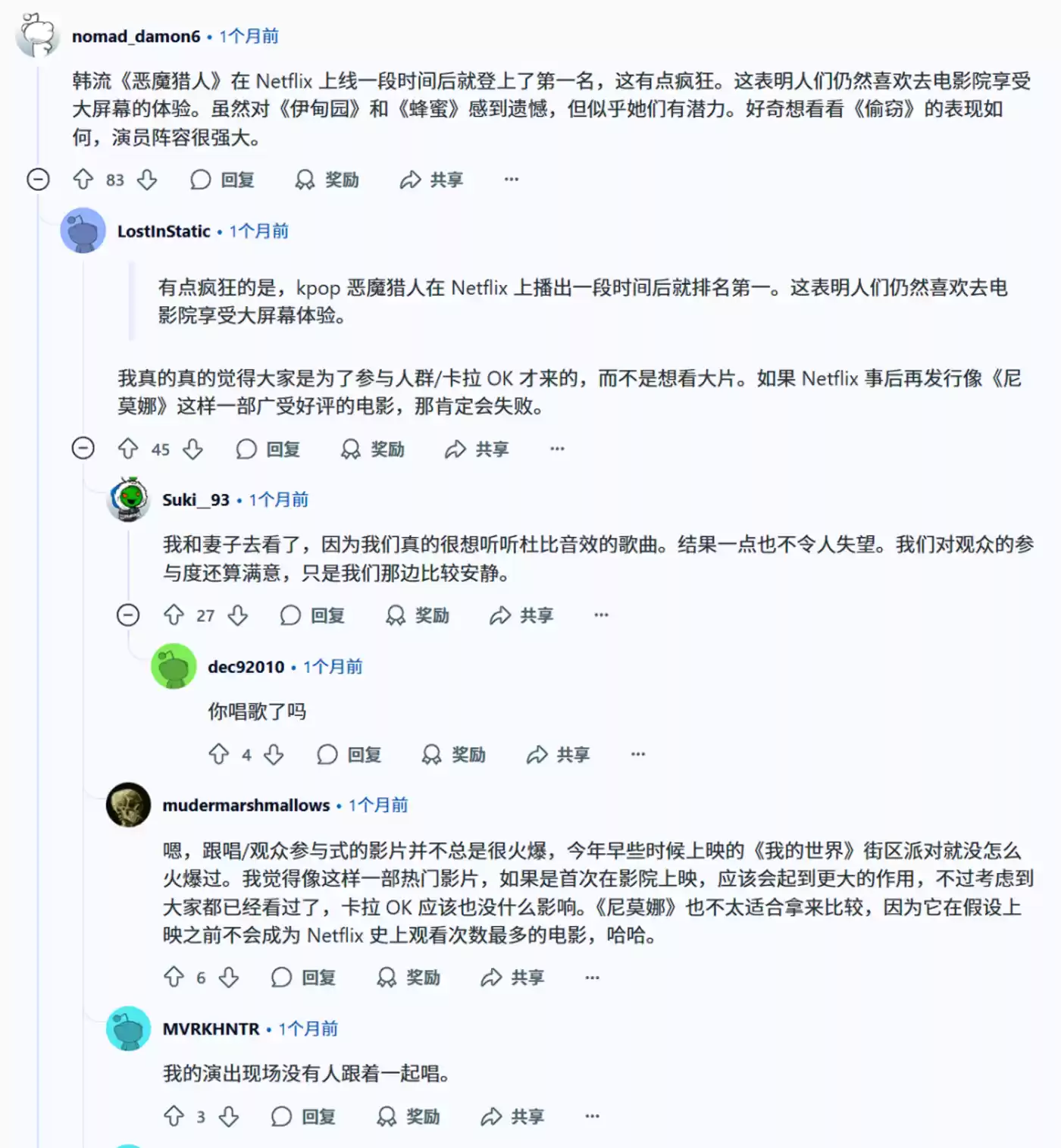 Netflix的三亿订阅用户是电影触达全球的基础。电影并非上线即爆,而是通过平台算法推荐和社交媒体的病毒式传播,逐步积累受众,最终登顶。从《鱿鱼游戏》到《猎魔女团》,Netflix投资韩流内容已经两次“押中”全球爆款,证明了其全球化战略的成功。