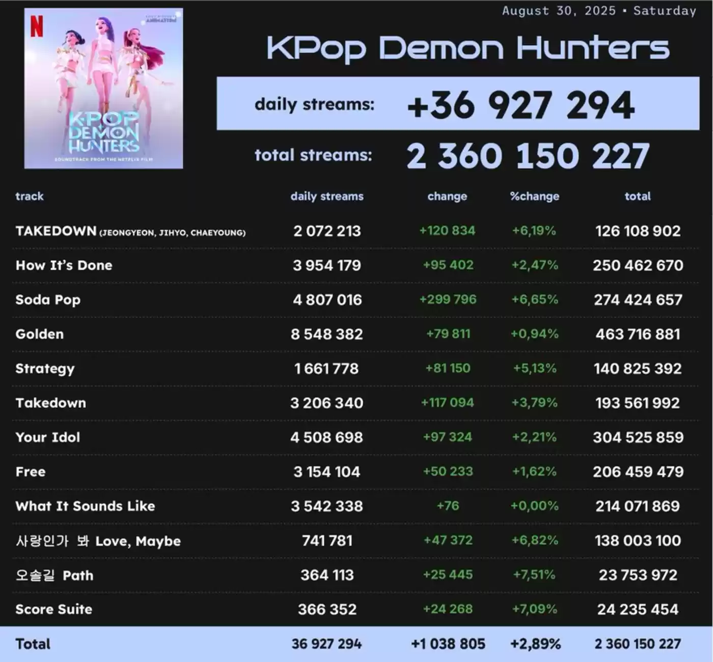 此外,该片音乐在全球流媒体平台的表现同样亮眼,Spotify数据中,原声带每首歌的播放次数都破亿,自7月以来几乎每周都稳居Spotify全球专辑榜冠军。