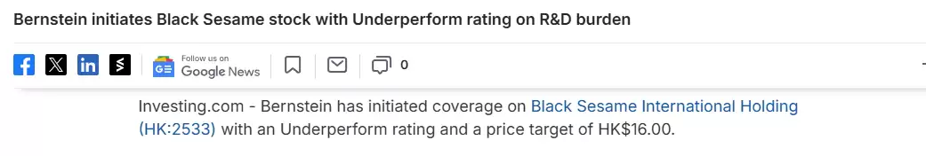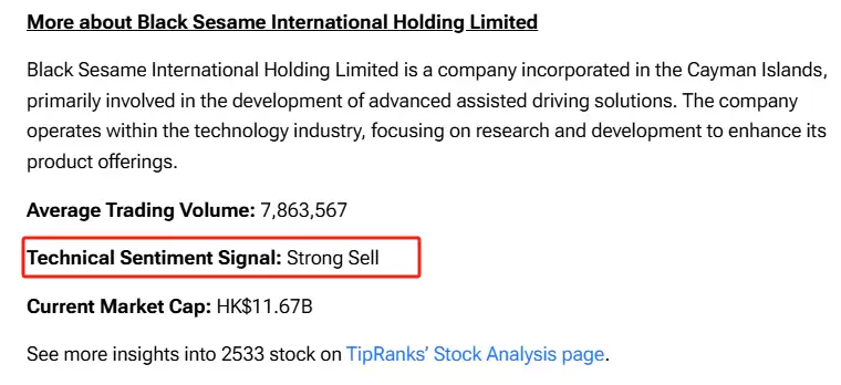 StockInvest.us指出,黑芝麻智能短期技术指标(如MACD)发出看空信号,长短期均线均呈空头排列,将其列为“卖出候选”。TipRanks显示,当前黑芝麻智能技术情绪信号为“强烈卖出”,反映市场对其短期缺乏信心。伯恩斯坦(Bernstein)给予黑芝麻智能“跑输大市”评级,目标价为16港元,低于当前股价。