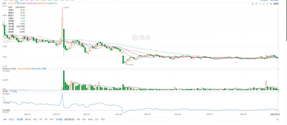 营收增速与规模双双落后于同行、叠加2025年上半年利润大幅下滑,导致黑芝麻股价持续承压。截至9月3日收盘,黑芝麻智能报17.87港元,市值为113.35亿港元。相比今年2月的高点——股价43.85港元、市值220.84亿港元,其在不到7个月内股价跌近六成,市值蒸发近半。
