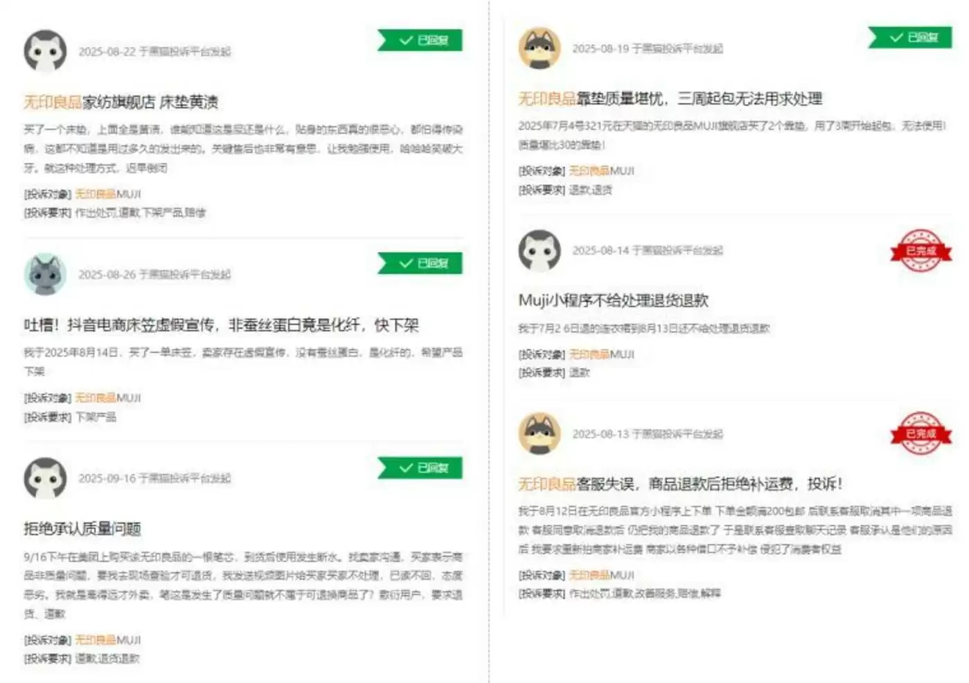 消费者的不满主要集中在二个方面,无印良品产品的质量和线上线下的服务品质上。据黑猫显示数据,输入关键词“无印良品”,投诉词条达2436条,其中产品质量占多数。