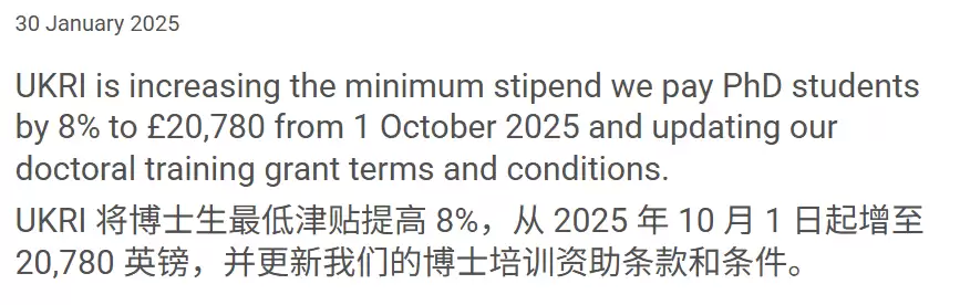 在英国,UKRI也不得不出手,从2025年秋季开始,将最低博士生津贴提高8%,新标准为£20,780/年,试图更贴近生活成本。