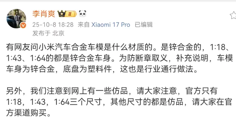 关于小米汽车车模的热议问题,小米汽车副总裁李肖爽在社交平台作出官方回应。他指出,最新发售的正版车模产品均使用锌合金材质制作主体车身,底盘部分则采用轻量化塑料材质,这种组合既保证了产品的质感表现又确保了整体轻盈度。现阶段官方仅推出1:18、1:43和1:64三种比例规格,其他尺寸或材质的车模产品均非小米官方授权商品。