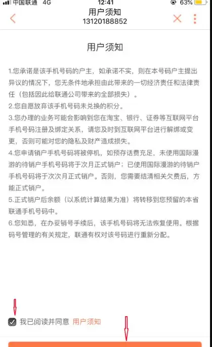 3、之后是销户合同的一堆注意事项,选择已经阅读并同意,接着下一步