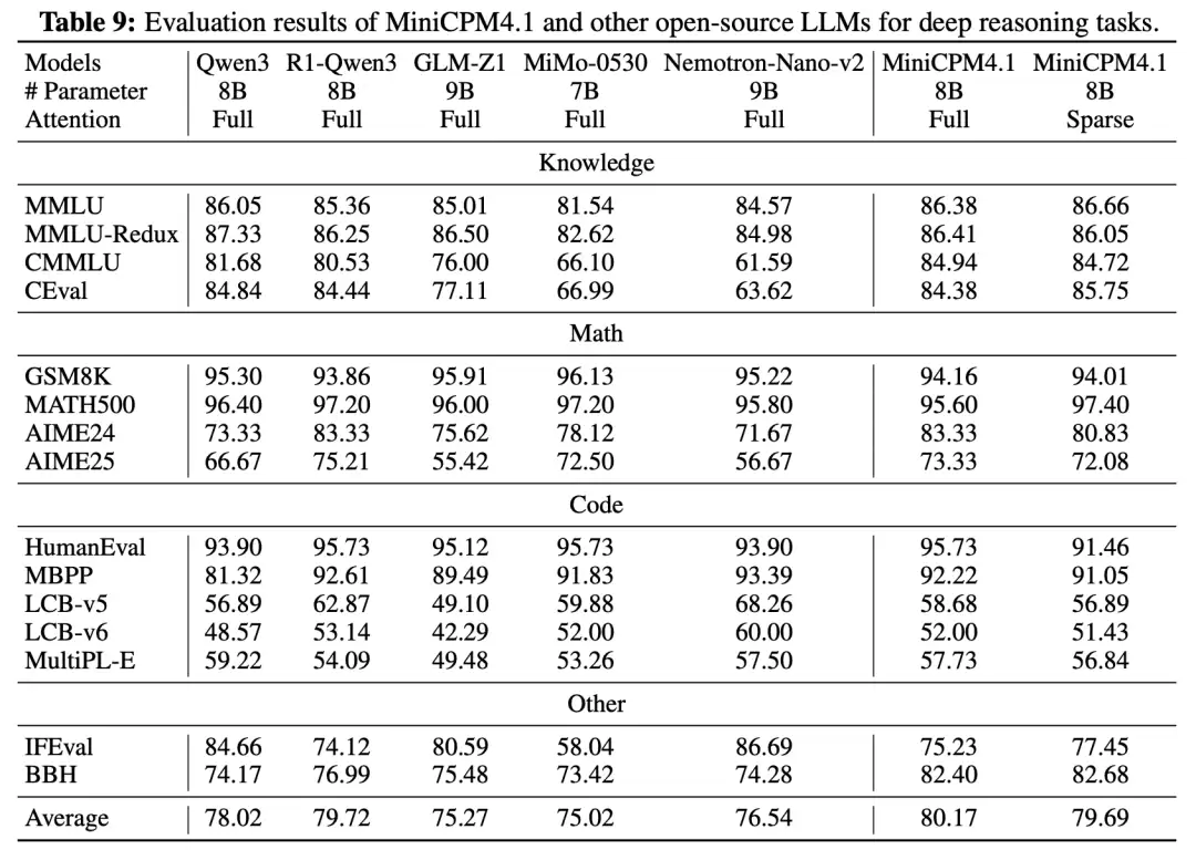 研究团队已在Hugging Face平台发布了MiniCPM4/MiniCPM4.1系列模型,这些开源原生稀疏注意力模型在多个专业测试中展现出卓越的性能表现。