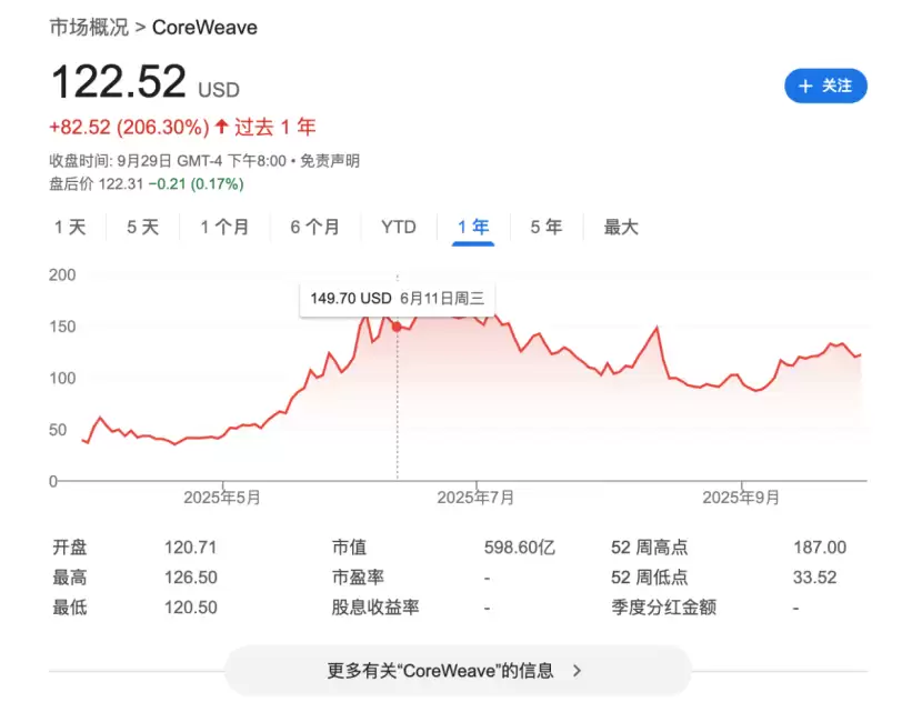 2025年最引人注目的科技股之一,一定是今年上市的CoreWeave。2025年由英伟达支持的CoreWeave上市,自IPO以来,其股价已上涨两倍多,最高涨幅接近4倍。