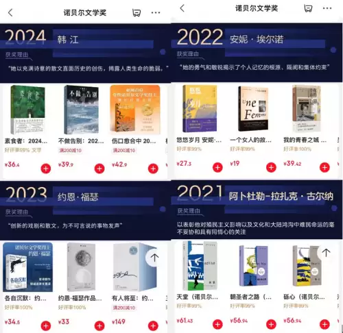 在京东诺贝尔文学奖主题会场中, 国内外文学佳作构建起多元的阅读图景,从经典传世之作到新晋得主代表作,每部都承载着独特的精神价值。2024年得主韩江的作品在获奖后迎来爆发式增长,其以“强烈的诗意散文直面历史创伤”,目前《素食者》《白》《失语者》三部曲套装,好评率高达98%。2024年得主约恩・福瑟的《秋之梦》以极简对话勾勒人际疏离,用沉默的留白传递存在主义焦虑。2024年安妮・埃尔诺的《悠悠岁月》用“无人称自传”的方式,以人们共有的经历反映时代的演变,从而引发人们内心的强烈共鸣。2024年阿卜杜勒-拉扎克・古尔纳的《天堂》聚焦东非移民群体,借少年视角书写殖民阴影下的身份挣扎……