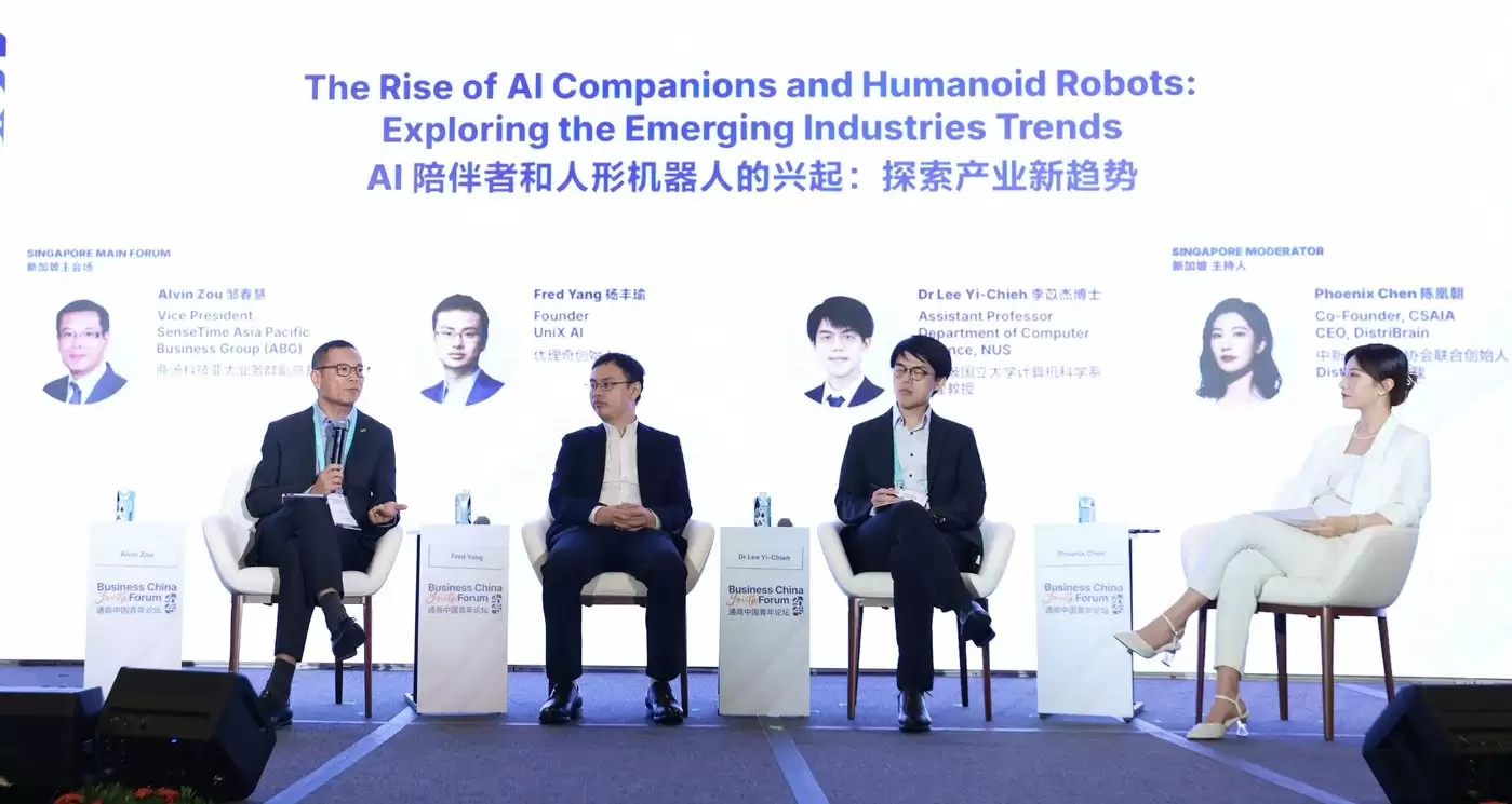 基于两国市场的互补性,由通商中国主办,中新人工智能协会(CSAIA)作为最新合作伙伴的2025通商中国青年论坛中,特别设置了“AI陪伴与人形机器人:探索产业新趋势”专题讨论,本次讨论汇聚了中新两国产学界的典型实践代表。