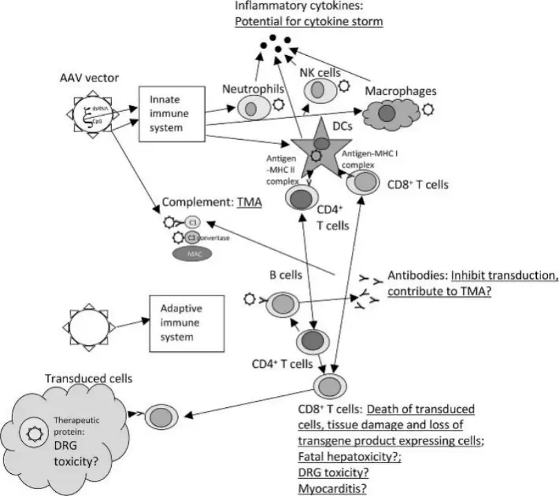 AAV进入人体后,可能激活先天免疫系统,引发由中性粒细胞、自然杀伤细胞和巨噬细胞介导的炎症反应,严重时甚至可能诱发细胞因子风暴;补体系统的参与则可能导致血栓性微血管病变。