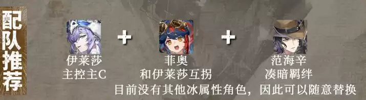 当灵能充足时,可用大招进行远程持续输出。适当穿插普通攻击能稳定维持灵能存量。在阵容搭配方面,建议为伊莱莎配置辅助角色。当前版本中菲奥是理想的冰系搭档,两人能激活特殊增益效果。暗系的范海辛可临时作为第三人选,主要是为了与菲奥形成羁绊效果。