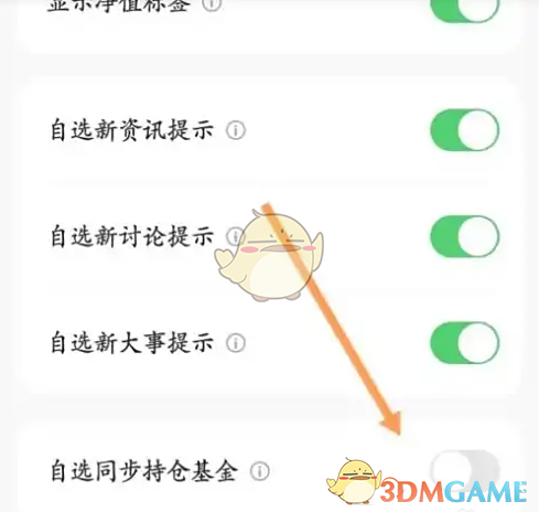 4、找到"自选同步持仓基金"功能后,开启右侧开关即可完成设置。