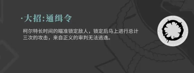 终极技"通缉令"具备强锁敌机制,三段必中攻击可无视敌人闪避效果,是击杀关键目标的终极大招,但要注意其较长冷却时间的特性。
