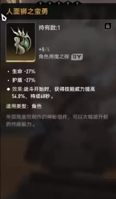 第三个关键组件人面狮之蛮勇虽然会降低27%生命值和护盾,但换来的是开局60秒内54%的技能威力提升。这个时间段往往决定了战斗的走向,特别适合那些爆发型角色。想想开场就直接释放终极技能会造成多么恐怖的伤害?在限时Boss战中,这套组合能帮你快速建立优势。