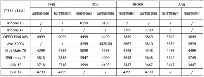 电商平台价格竞争呈现"京东领涨,拼多多领跌"的格局。监测数据显示,京东平台成为8款机型最低价的主要产生地,但价格波动最为剧烈,其中华为Mate70单周最高跌幅达400元。拼多多则凭借百亿补贴优势,成为价格洼地集中地,除小米17新品外,其他机型在该平台均出现不同程度降价。特别值得注意的是,国庆假期成为价格调整分水岭,华为Mate70在天猫平台单周暴跌800元,创下本周最大跌幅纪录。