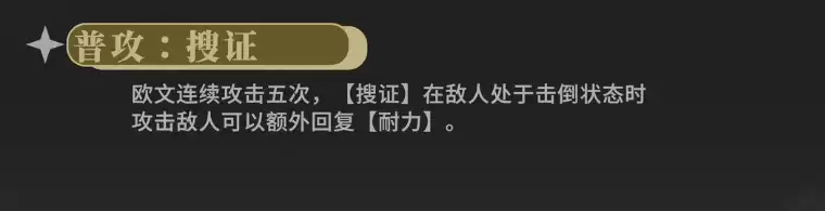 他本身装备的电气动力全套就是欧文的一个基础武器,可以根据全套的效果进行格斗类的攻击,因为他本身是格斗类型的角色,所以在输出上面也会根据这一点带来足够的怒气积累,他在普攻上面有一个搜证的能力,也是可以连续带来5次输出的,同时只要是在搜证的效果之内,那么敌人只要是处于击倒状态,欧文带来的输出能力会更多一些,而且还可以为自己带来怒气提升的效果。
