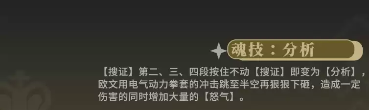 在魂技上面欧文可以带来一个分析的能力,在游戏中只要是使用普攻之后,就可以强化这个魂技的能力,在上面大家使用5次攻击的时候,在第2段、第3段以及第4段里面,只要按住不动技能键,就可以变成分析技能,也就是强化的效果,使用这个强化的效果会根据欧文的全套效果带来足够的加成,欧文会这个时候使用自己的电气动力全套,然后带来冲击能力,这个冲击能力会使他的动作变得更多,此时他会先跳到空中,然后狠狠的向下砸,造成一定的范围伤害,同时会增加很多的怒气数值来给自己做后期的加成准备。