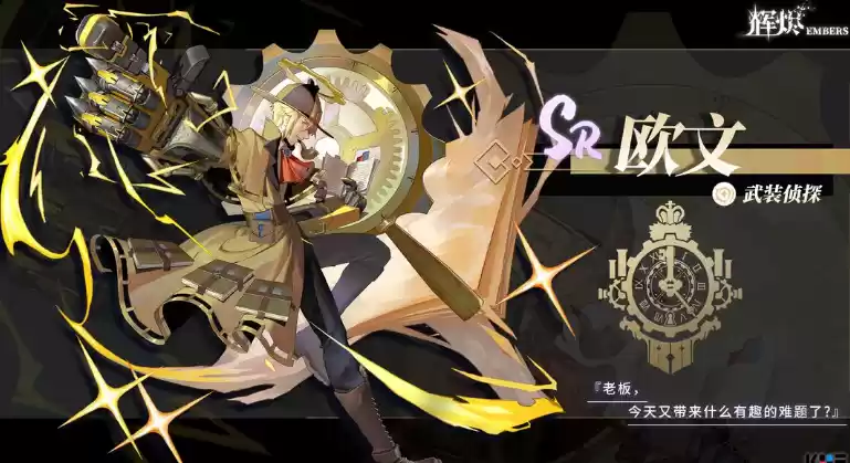 辉烬欧文强度怎么样?辉烬这款游戏当中如果大家对于外观很像侦探的这个男性角色很关注的话,那么本期小编就为大家带来欧文的解释,辉烬欧文强度如何其实是很多玩家的疑问,欧文他在游戏当中是万事通侦探社的社长,而且他的称号就叫做武装侦探,所以在外观上面,是很有侦探的那股范儿的,从外观上面大家看不出他的能力,但是从手上的拳套当中大家可以看出他使用的武器。