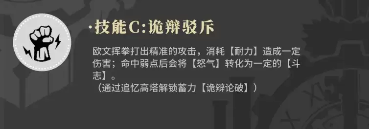 在技能3上面,欧文有一个诡辩驳斥的效果,诡辩驳斥的这个技能使用的时候欧文会挥动自己的手中的拳套,打出一次攻击会消耗一定的耐力数值,造成伤害之后,如果大家生命中弱点的话,那么此时会将怒气转化为一定的斗志,因为他是格斗类型的角色,有这个斗志数值,后期进行拳头输出的话,输出伤害会更大,所以建议大家可以在前期都是数值积累满之后再使用这个技能三。