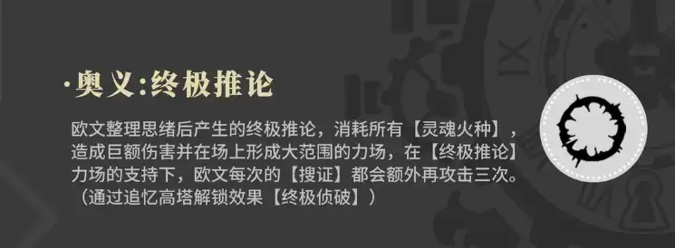 在大招上面,欧文会使用到的就是终极推论的效果,他只使用这个技能会消耗掉所有的灵魂火种,因为目前游戏当中所有的角色使用大招的时候,都会消耗掉自己的灵魂火种,然后造成伤害之后,在场上欧文还会形成一个大范围的力场,只要是在力场其中的敌人都会再受到额外攻击,且是连续的3次,这里受到欧文的输出数值是会根据力场效果变化的,所以在力场放在一个合适的区域中时,整体带来的攻击效果还是比较强的。