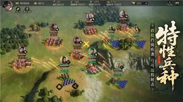 《三国群英传:策定九州》以真实即时战略(RTS)操作为核心,支持在战斗中对部队进行全程自由操控。主公可在高地、树林、桥梁、河流、峡谷等多种真实地形上灵活布阵,充分发挥各兵种特长:盾兵坚壁在前,弓兵据守远程,骑兵侧翼切入,形成立体攻防体系。