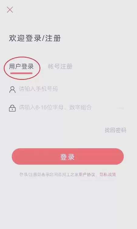 安装完成后打开川工之家APP,在登录界面就能看到明显的"账号注册"按钮,点击即可进入注册流程。