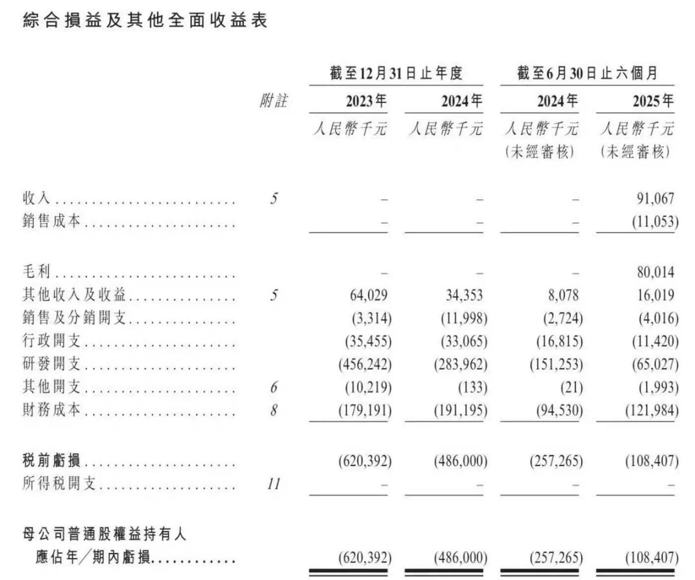 但由于尚未有产品实现商业化上市,先为达生物目前仍处于亏损阶段。2024年、2024年及2025年上半年,公司营收分别为0元、0元、9107万元;净亏损分别为6.2亿元、4.86亿元、1.08亿元,两年半累计亏损超12亿元。