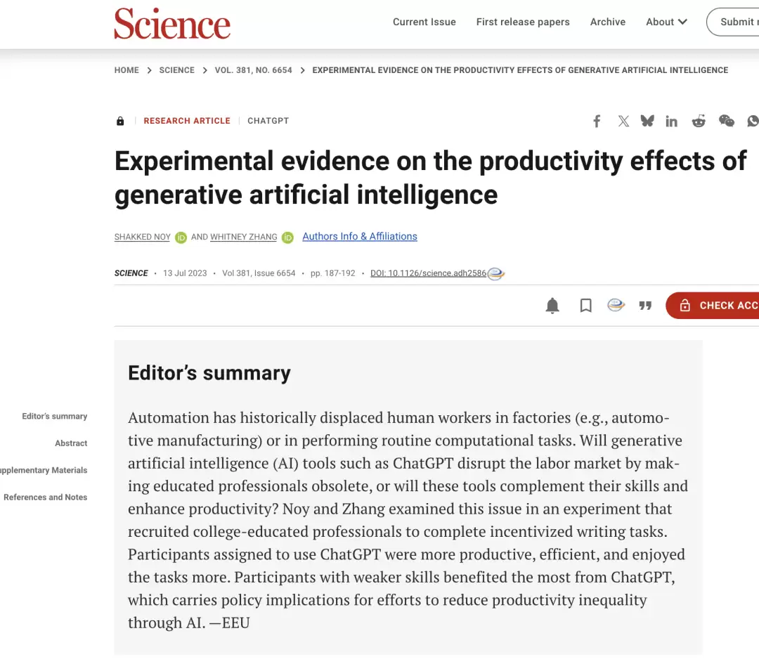 Noy, S., & Zhang, W. (2024). Experimental evidence on the productivity effects of generative artificial intelligence.Science,381(6654), 187-192.