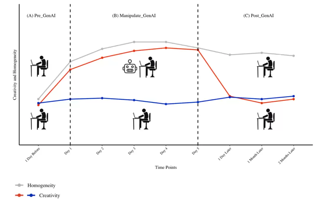 Zhou, Y., Liu, Q., Huang, J., & Li, G. (2025). Creative scar without generative AI: Individual creativity fails to sustain while homogeneity keeps climbing.Technology in Society, 103087.