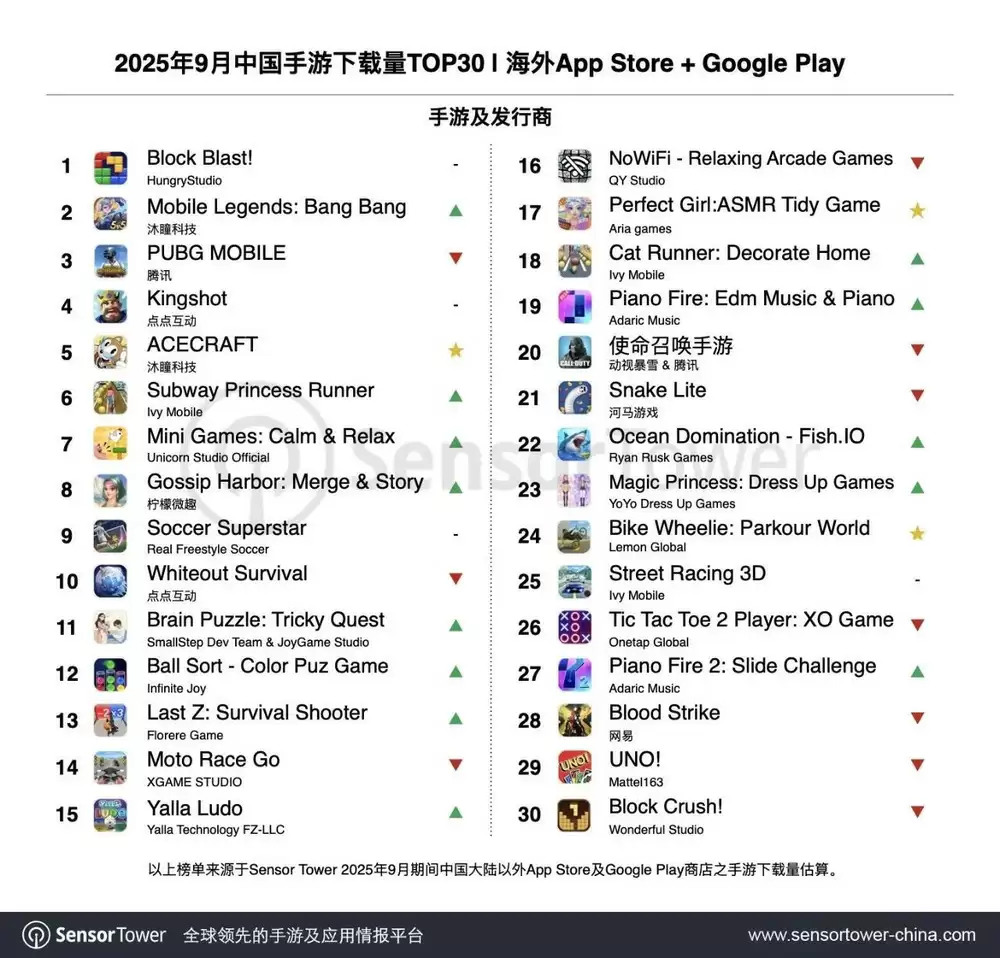 10月11日讯 最新一期Sensor Tower商店情报数据显示,9月中国手游在海外市场的表现亮点纷呈。以下是详细榜单变化。