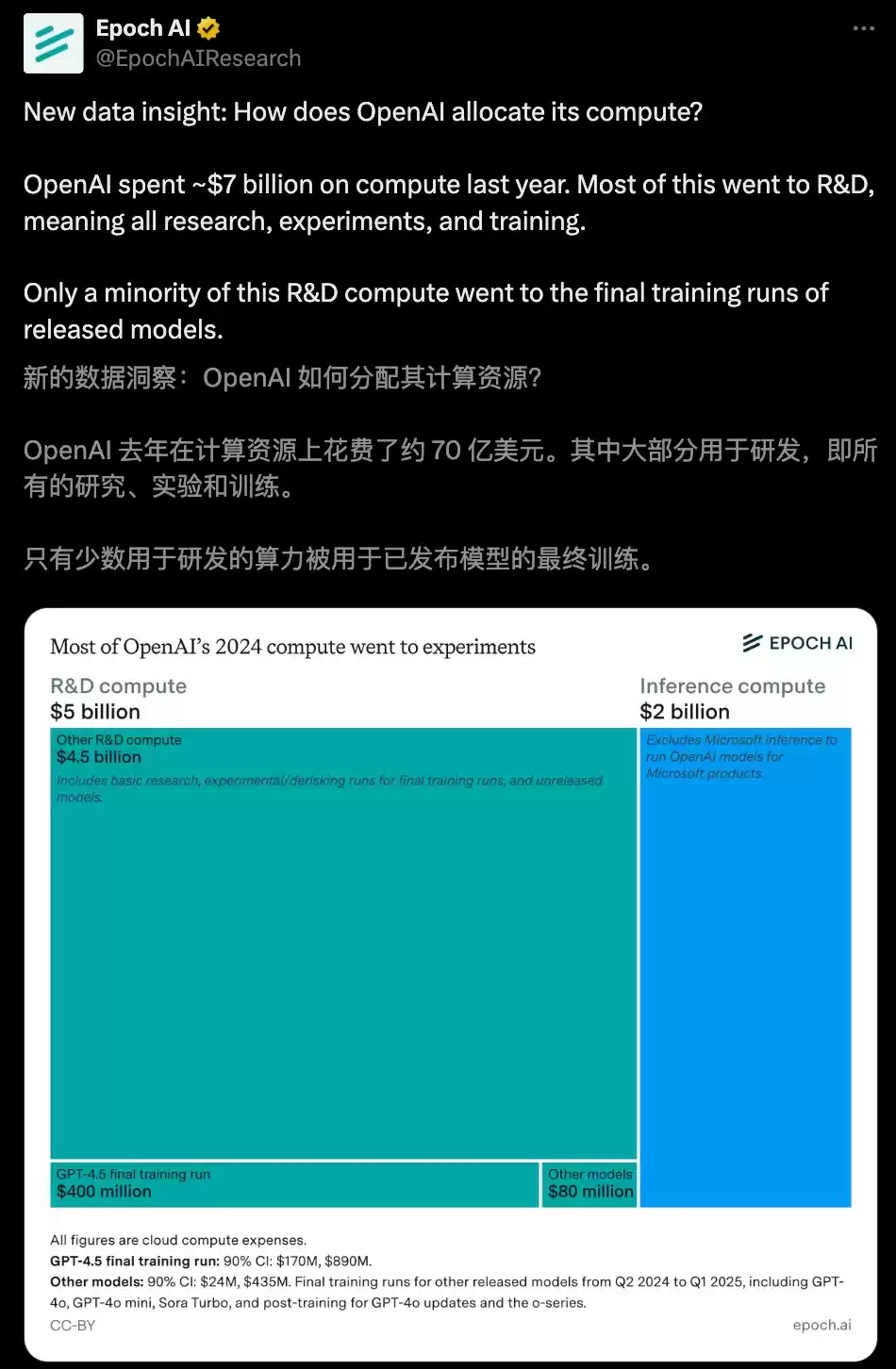 其中,大模型研发占了最大头——50亿美元,而推理计算仅用了20亿美元。