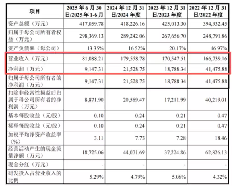 2024年、2024年、2024年和2025年1-6月(报告期),公司营业收入分别为16.67亿元、17.05亿元、17.96亿元和8.11亿元,归属于母公司所有者的净利润分别为4.15亿元、1.88亿元、2.15亿元和9147.31万元,2024年净利润大幅下滑。