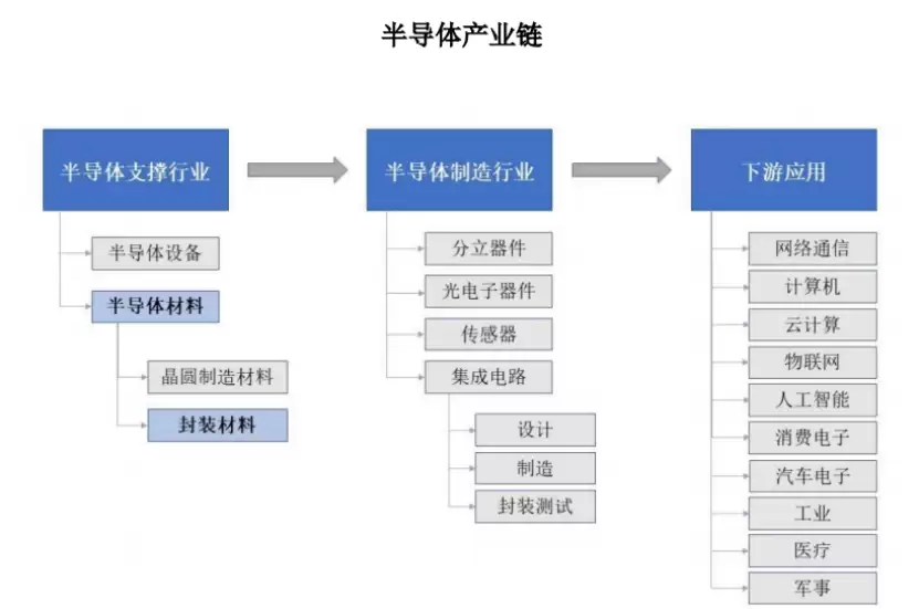 半导体支撑产业主要提供半导体设备和材料,其中半导体材料分为晶圆制造材料和封装材料,公司的产品属于封装材料。