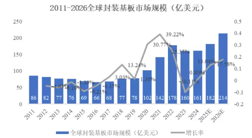 根据Prismark数据显示,全球封装载板市场规模已从2024年的周期性低谷160亿美元实现至2024年的逐渐复苏。