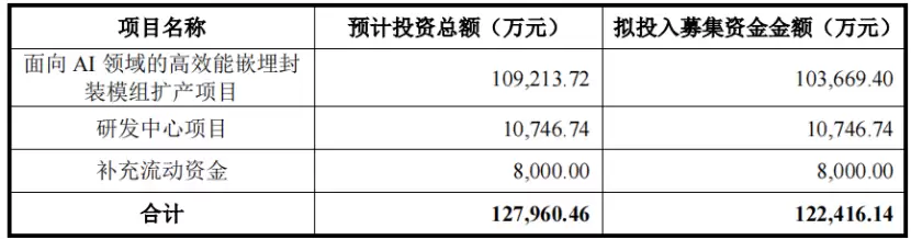 越亚半导体本次募集资金总额为12.8亿元,主要用于面向AI领域的高效能嵌埋封装模组扩产项目、研发中心项目和补充流动资金。