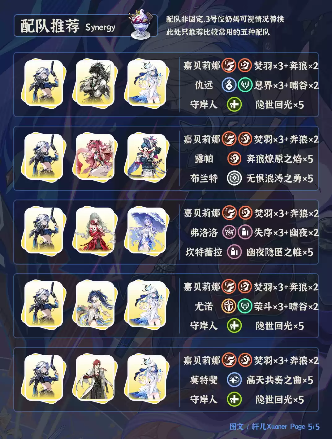 嘉贝莉娜的核心输出依赖于声骸效果,根据主流声骸套装及版本趋势分析,与仇远征形成了最优拍档组合(仇远的声骸配置仍需实测)。在没有仇远的情况下,推荐组建嘉贝莉娜+露帕+布兰特的新生代火系战队,其中露帕能显著提升整体战力,而布兰特则可补充不俗的伤害输出。如果未能获取布兰特,可选用守岸人、莫特斐或长离等替代人选。除露帕外,嘉贝莉娜还能与尤诺、弗洛洛、莫特斐等能强化重击效果的角色产生优秀联动。