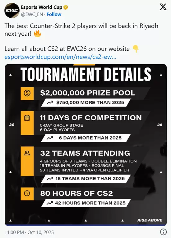 EWC电竞世界杯组委会近日披露了2026年CS2项目的详细安排,引入多项突破性变革:正赛战队数量将由16支激增至32支,总奖金池提升至200万美元,较上届增加75万美元奖金。