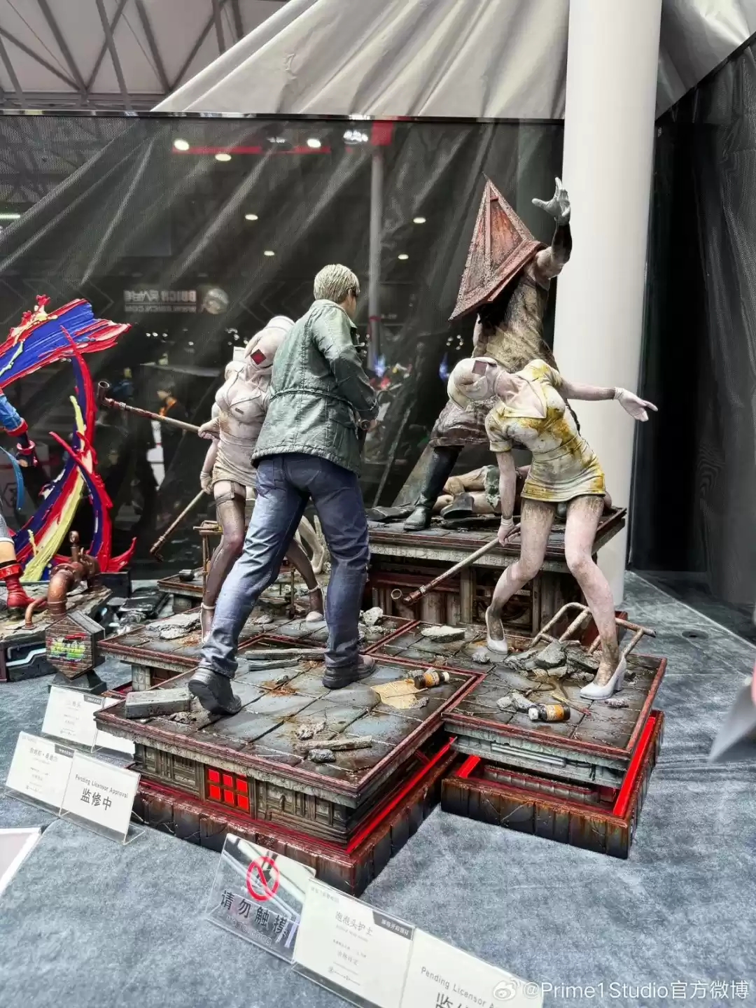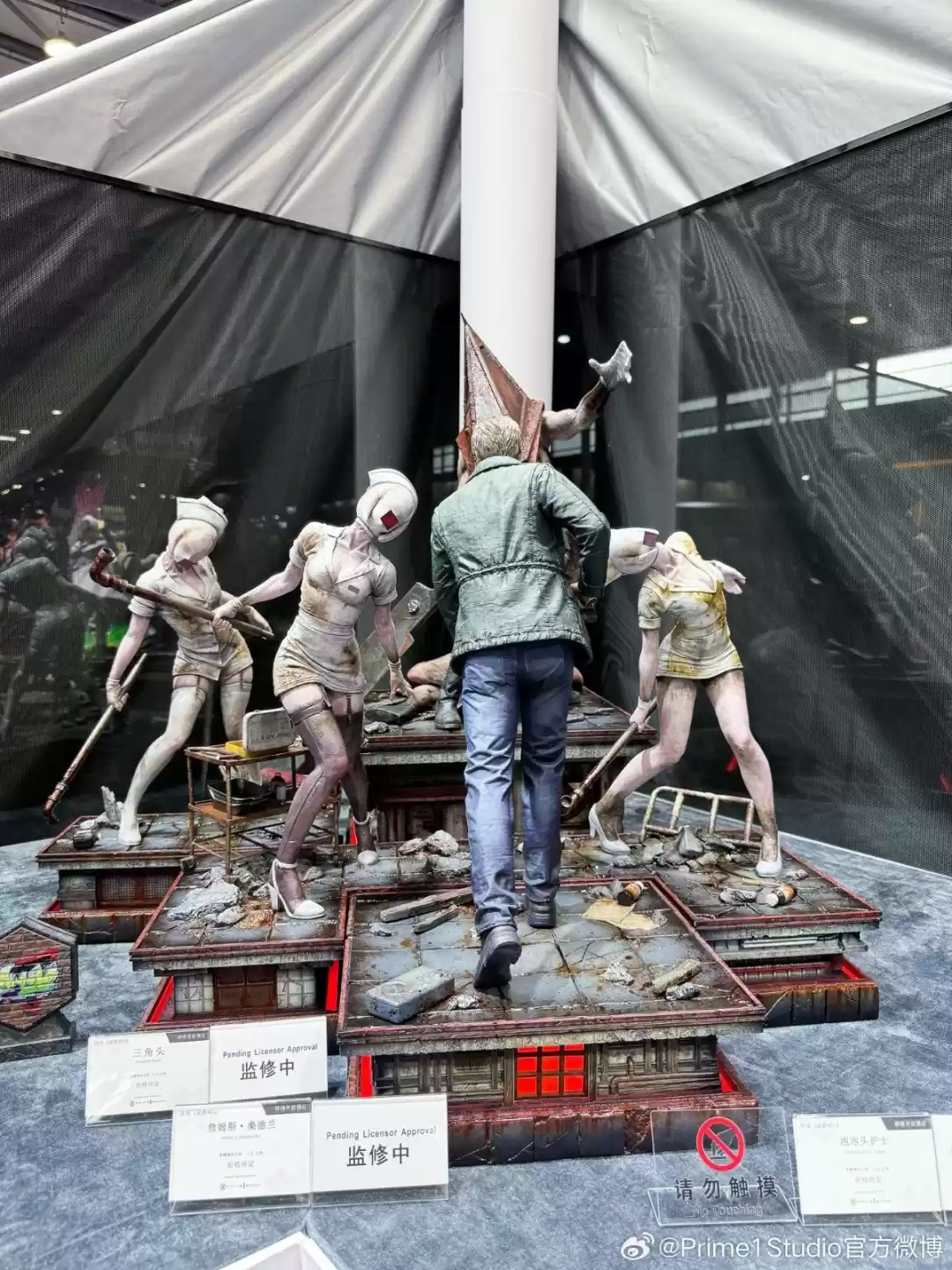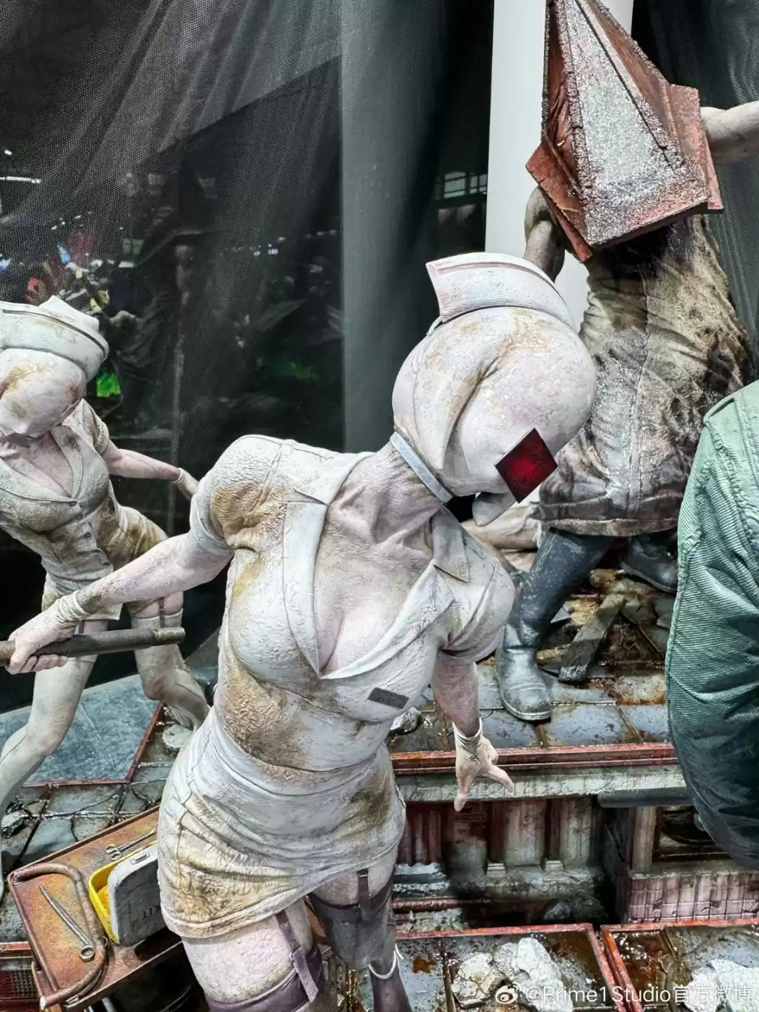 现场曝光的实物照片显示,这些雕像高度还原了游戏中令人难忘的形象。詹姆斯沧桑憔悴的面容、迷茫而痛苦的眼神都被完美复刻,而三角头厚重的金属头盔和护士扭曲的肢体动作更是将寂静岭独有的惊悚氛围表现得淋漓尽致。