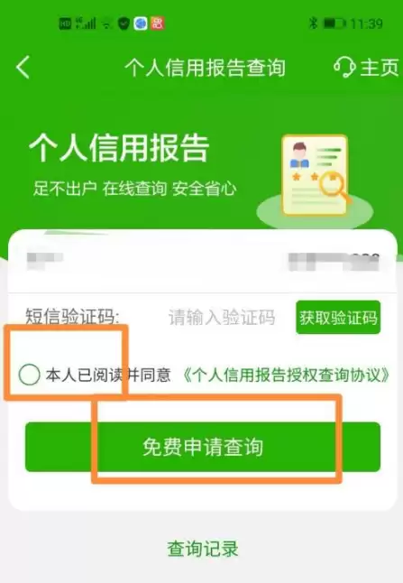获取短信验证码,查看并勾选授权协议后,点击【免费申请查询】