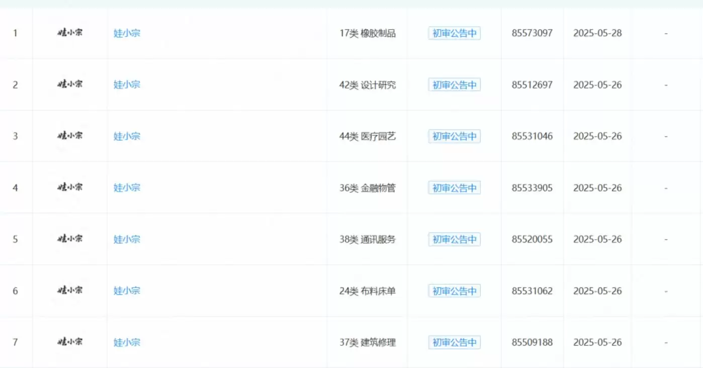 娃小宗申请了多个品类的商标
