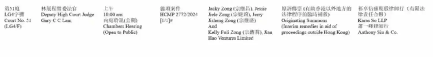 宗继昌、宗婕莉、宗继盛在香港高等法院提起诉讼,要求阻止宗馥莉处置汇丰银行账户内的18亿美元资产,并追讨其父宗庆后生前承诺的21亿美元(约150亿人民币)信托权益。