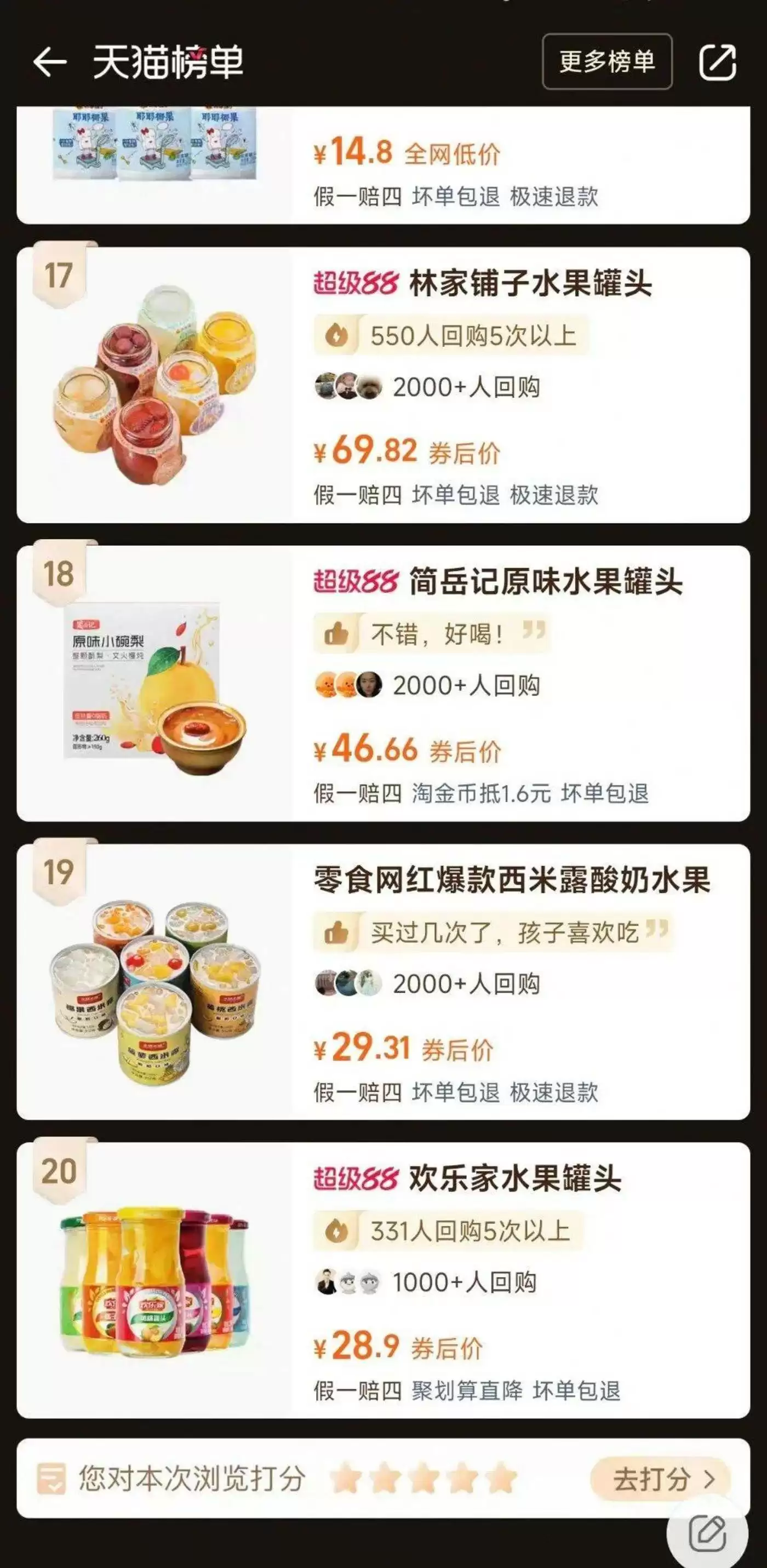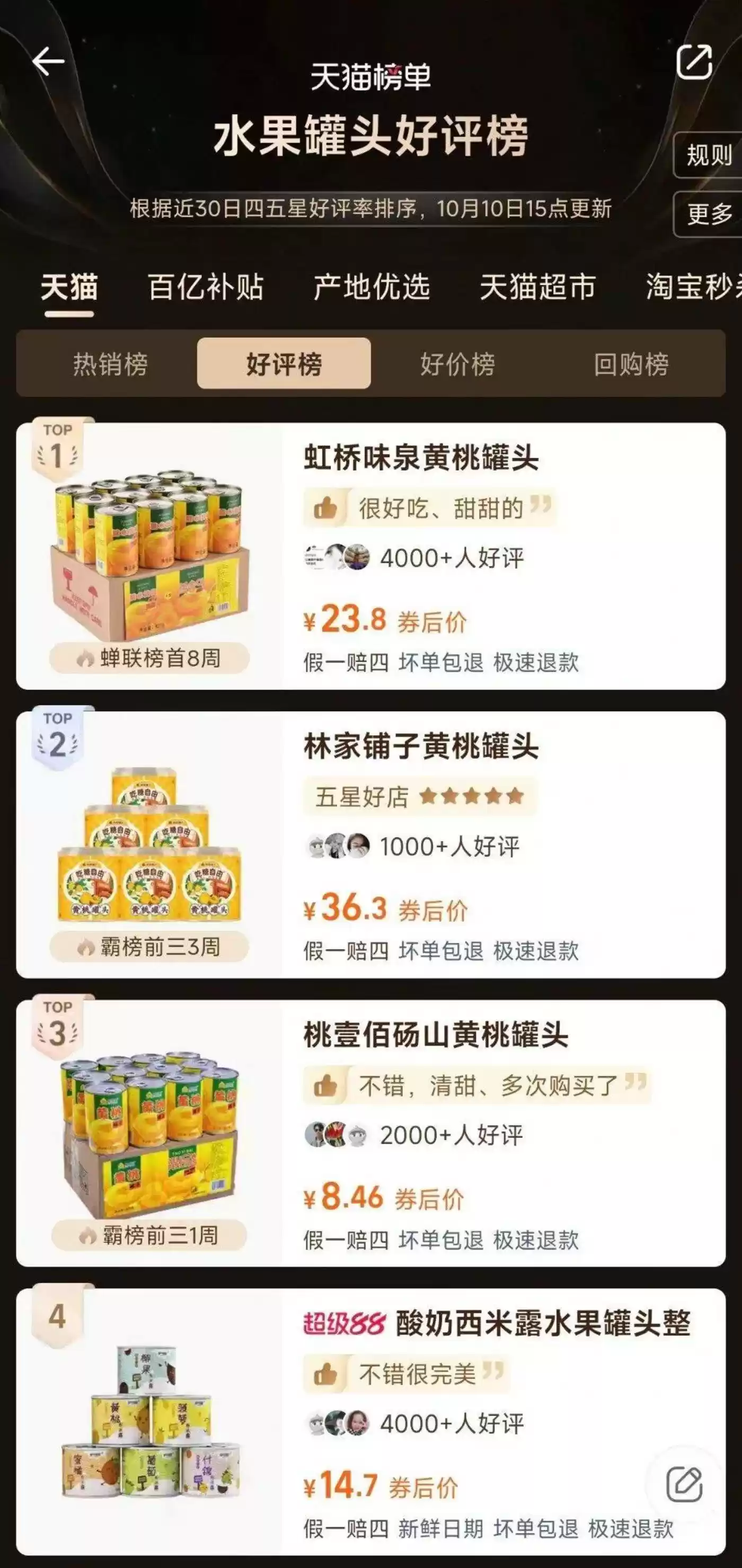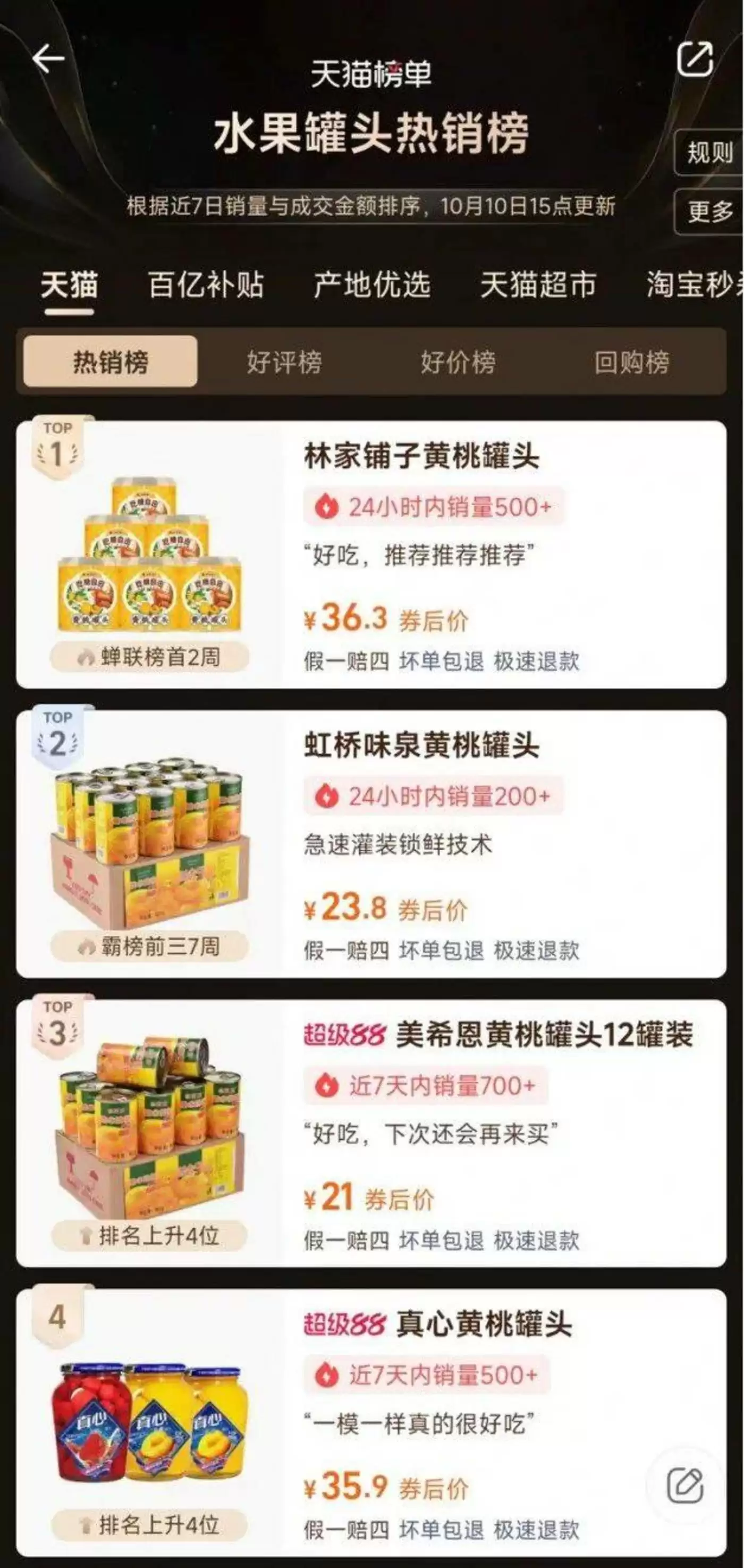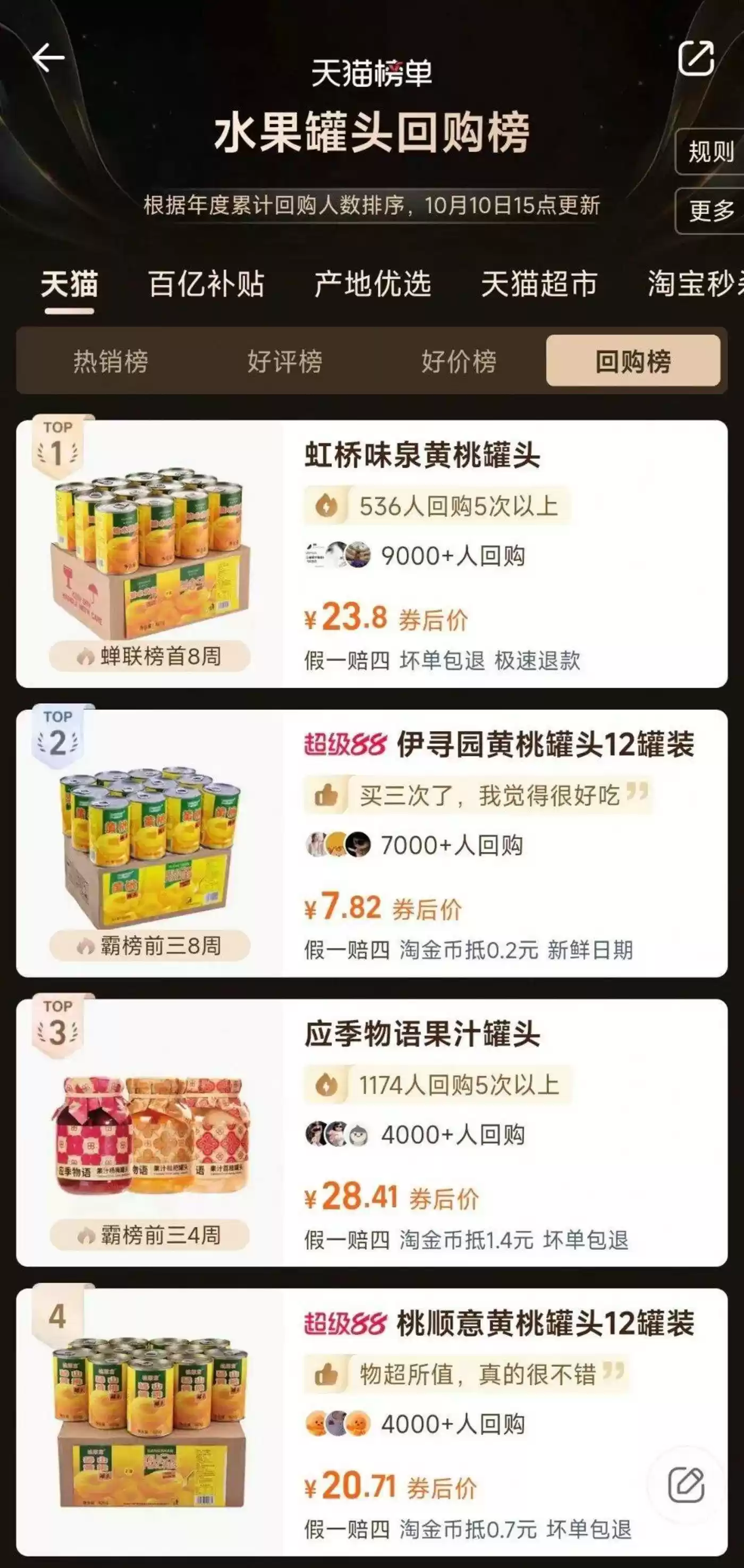 而天猫平台的“水果罐头”好评榜和回购榜里,销量前三分别是虹桥味泉黄桃罐头、林家铺子黄桃罐头、桃壹佰砀山黄桃罐头和虹桥味泉黄桃罐头、伊寻园黄桃罐头、应季物语果汁罐头,欢乐家只在天猫回购榜里排第20名。
