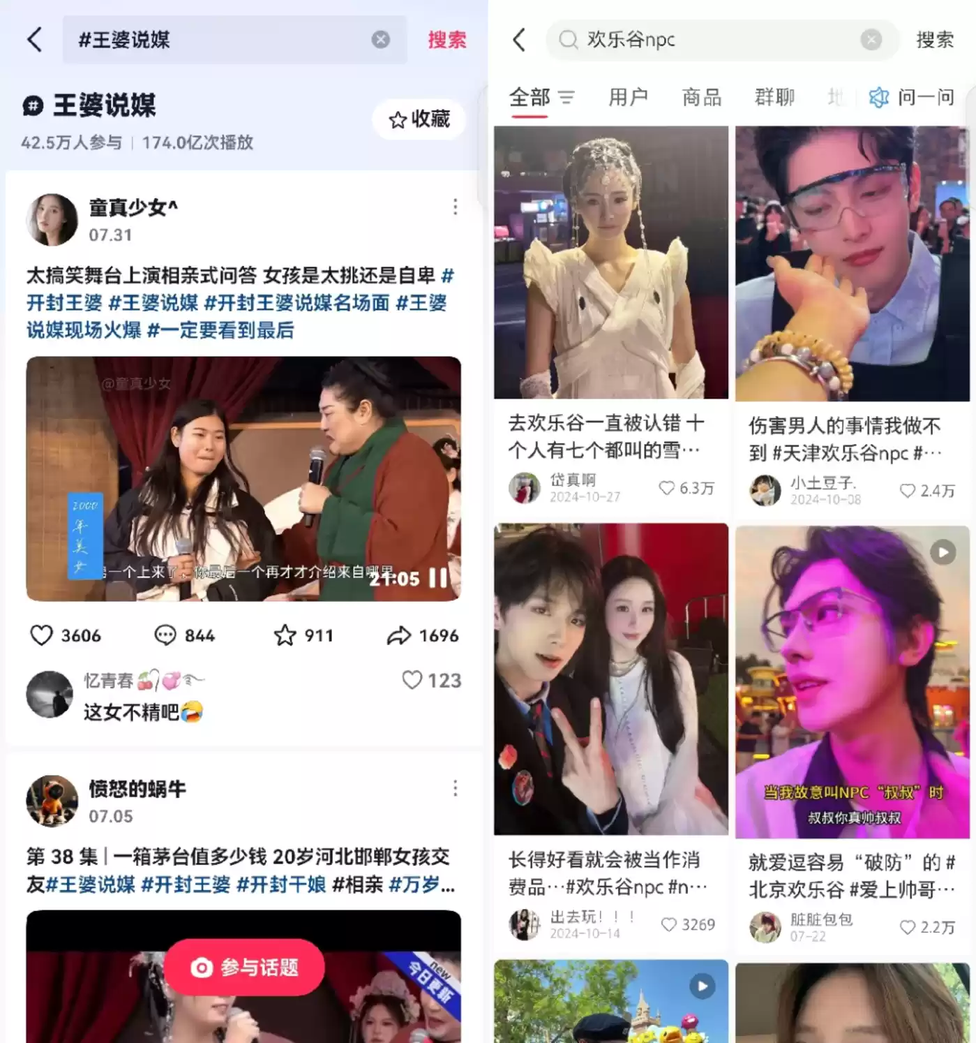 2024年,通过各种节假日限定巡游,各地欢乐谷在抖音上迅速铺开了声量,同年国庆,开封万岁山登顶抖音全国网络热门打卡景点,超越龙门石窟。此后至今,「王婆说媒」和万岁山热度不减,已成为万岁山的招牌节目,王婆演员的抖音账号积累了765万粉丝,并时常被外派至其他景区巡演,档期已经排到了11月。