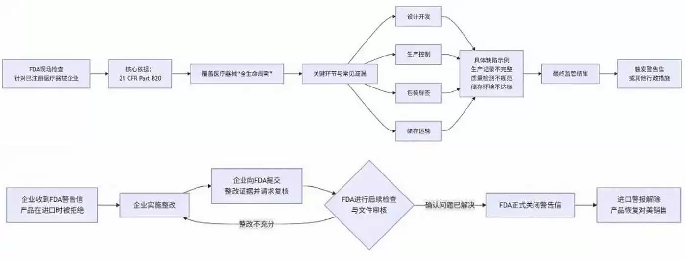 21 CFR Part 820作为核查的根本依据,是多数医疗器械在美国上市之前必须遵守、上市之后随时可能抽查的基本要求,涵盖了从产品设计开发、生产过程控制、包装标签管理到储存运输的全链条。任何一个环节的疏漏,诸如生产记录不完整、质量检测流程不规范、储存环境不达标等,都可能触发警告信。