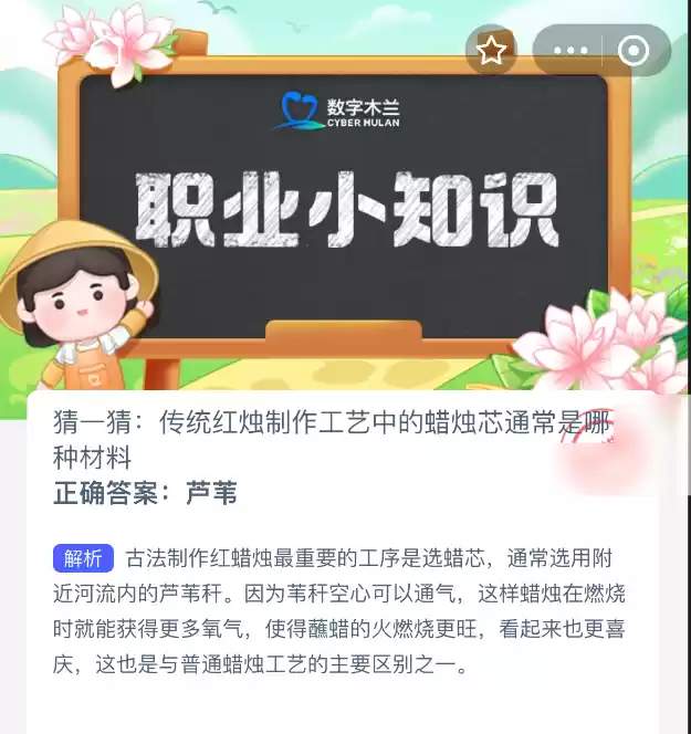 猜一猜:传统红烛制作工艺中的蜡烛芯通常是哪种材料?【蚂蚁新村每日一题】2025年10月11日题目已发布!坚持答题,积累木兰币,即可加速小镇建设。答对本题,立即可享“产速+3/时”的加速奖励!今天正确答案是【芦苇】。古法制作红蜡烛最重要的工序是选蜡芯,通常选用附近河流内的芦苇秆。
