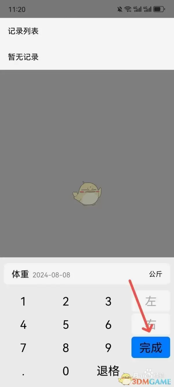 3、在体重记录页面填写最新数值,确认无误后点击"完成"保存
