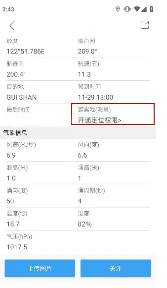 4、点击"信息"按钮可查看完整船舶微档案,包括实时航速、定位坐标、目的地等详细数据。注册用户还能使用"距离我"功能追踪船舶与本机的实时距离(需开启定位权限)。
