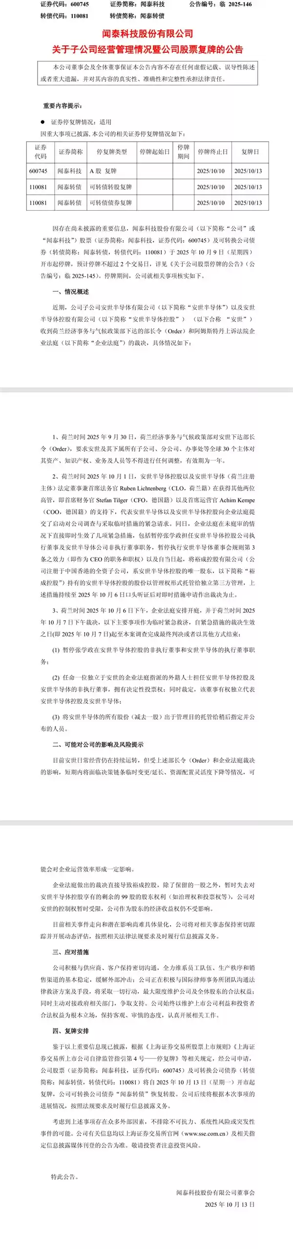 公告特别说明,虽然荷兰政府的行政令和企业法庭裁决暂时限制了管理权,但闻泰科技仍保有安世半导体的全部经济收益权。公司将于10月13日恢复股票交易。